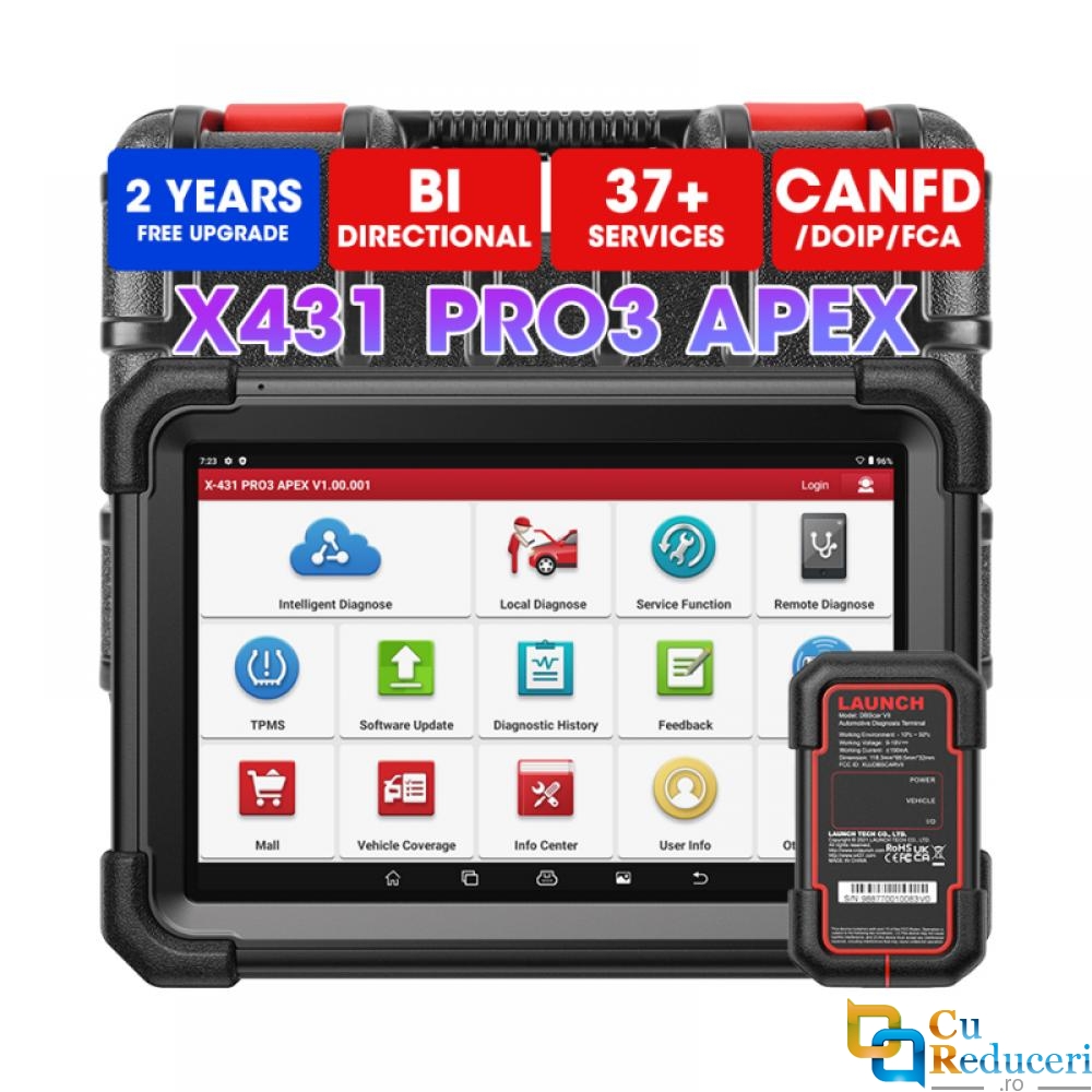 LAUNCH X431 PRO3 APEX este un scanner auto profesional de diagnostic spre nivel OE, conceput pentru ateliere auto, service-uri si mecanici profesionisti care au nevoie de diagnoze complexe, testari bidirectionale si functii extinse pentru vehicule 12 V si 24 V.